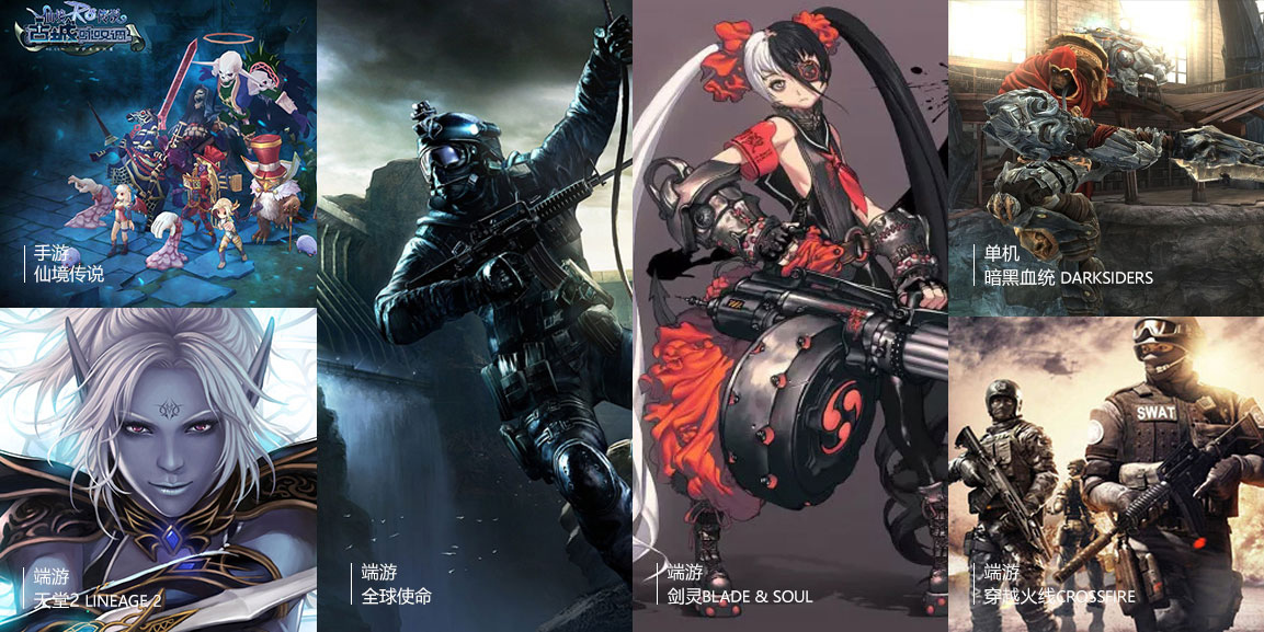 《穿越火線》、《天堂2》、《地獄之門》、《暗黑血統(tǒng)》、《全球使命》、《戰(zhàn)爭機器資料篇》、《劍靈》等項目。